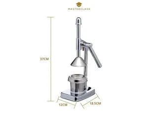 Exprimidor manual, con un elegante diseño cromado. Práctico y decorativo. Ideal para tu cocina. Vaso con capacidad 1/3 litro. - Material: Metal cromado. - Base estable y robusta. - Palanca de presión ergonómica.