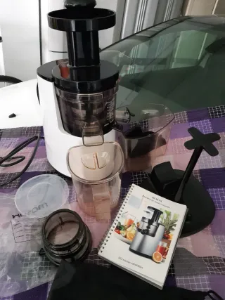 Licuadora y exprimidor de la marca Hurom. Ideal para preparar zumos naturales. - Diseño moderno en color blanco y negro. - Incluye todos los accesorios visibles en la imagen. - Manual de recetas incluido.