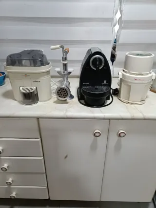 Lote de pequeños electrodomésticos para tu cocina. - Cafetera Nespresso Krups. - Picadora manual. - Exprimidor Ufesa. - Picadora Moulinex.
