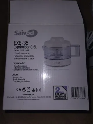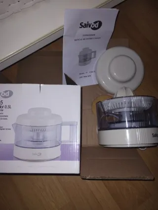 Exprimidor eléctrico Saivod modelo EXB-35. - Diseño compacto y funcional. - Capacidad de 0,5L. - Incluye tapa protectora. - Manual de instrucciones. Nunca se ha usado