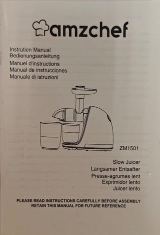 Exprimidor de la marca Amzchef, modelo ZM1501. Incluye manual de instrucciones en varios idiomas. Solo usado dos veces. Valorado en 120€ Licuadora prensado en frío. Extractor de zumos y verduras. Licuadora con 2 depósitos y cepillo. Diseño compacto y elegante. Fácil de usar y limpiar. Capacidad máxima de 700ml.