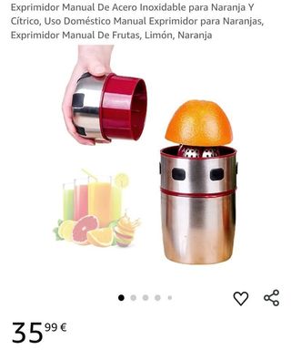 Exprimidor manual de plástico con manivela para extraer zumos. - Diseño en color naranja. - Jarra medidora incorporada con marcas de 200 ml, 300 ml, 400 ml y 500 ml. Muy cómodo para las que tenemos problemas de artrosis en las manos. No es eléctrico pero funciona bien.