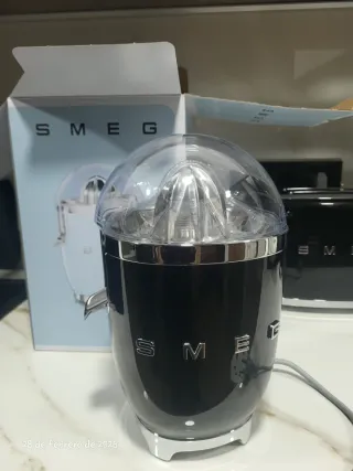 Exprimidor de cítricos de la marca SMEG en color negro. Su diseño retro le da un toque elegante a tu cocina. - Cuerpo de aluminio pintado. - Tapa protectora transparente. - Base cromada.