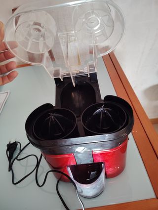 Exprimidor doble. Color rojo y negro. Vaso para 500 ml. Dos conos para exprimir. Corte fácil al bajar la tapadera. Las partes no mecánicas son todas lavables. Presión automática del exprimidor. Nuevo , sin utilizar