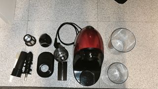 Se vende máquina extractora de zumo lenta, ideal para obtener jugos frescos en casa. Su diseño moderno y compacto la hace perfecta para cualquier cocina. - Incluye todos los accesorios visibles en la imagen. - Color rojo y negro. - Dos vasos transparentes incluidos.