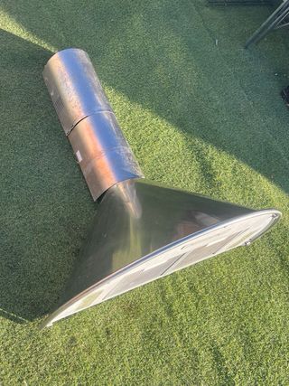 Campana extractora de acero inoxidable, ideal para cocinas industriales o comerciales. Su diseño robusto y acabado brillante la hacen una pieza funcional y duradera. - Fabricada en acero inoxidable. - Diseño de campana extractora. 2metros