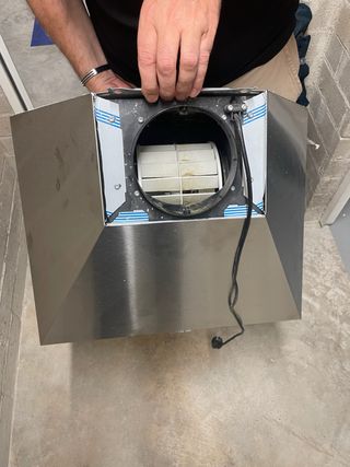 Campana extractora de cocina de acero inoxidable, ideal para renovar tu cocina. - Estructura principal de acero inoxidable. - Incluye filtros. - Componentes del motor visibles.