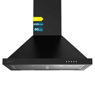 Campana extractora de cocina en color negro, con un ancho de 60cm. Campana extractora de la marca Cecotec, con un ancho de 60 cm. Bolero Flux PM 606500 Black A Campana piramidal de 60cm de ancho, acabado negro, succión 650m3/h, Motor 165W, Clase A, control mecánico, 3 niveles de potencia, luz y filtro de carbono. - Clase energética A. - Potencia de extracción de 650 m3/h. - Diseño moderno y elegante. - Acabado en negro mate.