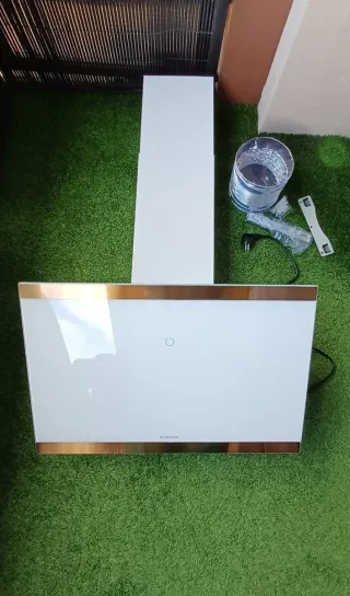 Campana extractora decorativa de 90cm. Luz led - Acabado acero inox - Panel de control táctil con indicadores luminosos. - se vende x reforma tiene 1 año de uso funciona perfectamente , se da con todos sus anclajes de pared . Los filtros se ven feos x que se metieron en el lavavajillas y se pusieron como se ve en la foto