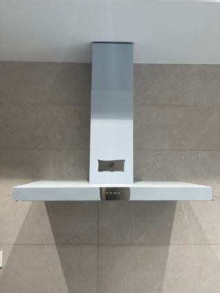 Campana extractora Soler & Palau BOX 900 E INOX. Es de 90 cm, completamente nueva y sin usar, por eso lleva un plástico blanco protector. La campana es entera de color acero inoxidable y se entrega con el manual original. Disponible con envío o para recoger. Campana de cocina decorativa. Características: -Compuerta antirretorno. -Filtro metálico. -Selector velocidades/luz. -Evacuación superior. -Reductor de conducto descarga de Ø150 mm a Ø120 mm.