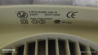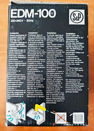 Extractor de ventilación para baños y aseos S&P. Nuevo, nunca se ha usado pero puede tener algún rasguño por haber sido expuesto en un escaparate. - Modelo EDM-100 CE. - Voltaje: 220-240V. - Frecuencia: 50Hz.