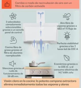 Transforma tu Cocina con Elegancia y Tecnología Experimenta la perfecta combinación de estilo y funcionalidad con esta campana extractora. Diseñada para integrarse armoniosamente en cualquier cocina. Captura la grasa y los olores, purificando el Aire. Diseño estilizado que aporta un toque moderno a tu espacio. - - - Equipada con tecnología de vanguardia. Rendimiento excepcional manteniendo bajos niveles de ruido, permitiéndote disfrutar de una cocina libre de humos y sonidos molestos. Con iluminación LED RGB de clase A. Fácil instalación para que puedas crear tu mismo, el ambiente perfecto. SUPER PRECIO DE OPORTUNIDAD!!!