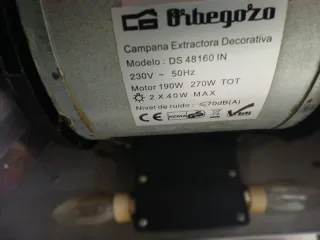 Campana extractora decorativa de la marca Orbegozo. Diseño moderno en acero inoxidable. - Acabado en acero inoxidable. - Controles integrados en la parte frontal. -Botón apagado, tres posiciones de absorción, luces 2 bombillas. -Dos filtros de carbón. - Diseño piramidal. -Se encuentra en buen estado. Solo se le borro el nombre de la marca ,en la parte frontal.