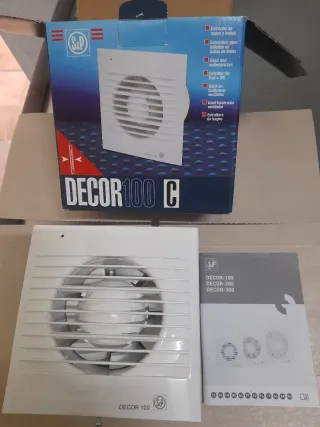 Se venden extractores de humos/baño marca SP modelo Decor-100 con pilotos de señalización encendido, base plantilla instalación, tornillos fijación, membrana antirretorno y tensión a 230V/13W/2500RPm color blanco marfil. Medidas 158 mm ancho x 68 mm de fondo, diámetro agujero 98 mm.