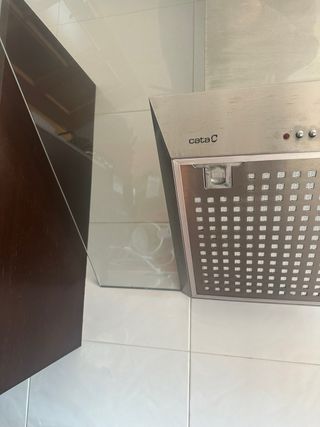 Campana extractora decorativa de la marca Cata. Diseño moderno en color negro y acero inoxidable. - Modelo Cata 01278205 - Acabado frontal en cristal negro. - Cuerpo superior en acero inoxidable. Vendo por mudanza: Tengo más cosas en venta, si compras varias aplico un 10% de descuento en cada producto