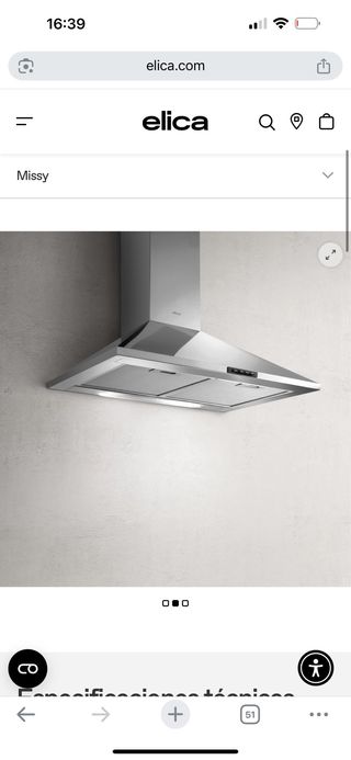 Campana extractora ELICA MISSY PB IX/A/90 De 90 cm Usada tan solo un par de meses, se encuentra como nueva. Luz integrada, 3 velocidades, 3 filtros extraibles Especificaciones técnicas en la última imagen del anuncio
