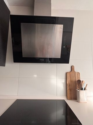 Campana extractora de cocina Fagor con acabado en cristal negro. Medidas: 60 cm x 80 cm. Funciona perfectamente. Se vende por cambio de cocina. Se entrega desmontada. - Diseño moderno. - 3 velocidades. - Panel de control táctil. - Filtros metálicos. - Iluminación integrada.