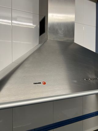Campana extractora de la marca Fagor. Un accesorio funcional para tu cocina. - Acabado en acero inoxidable. - Diseño moderno y elegante. Tiene ya sus usos por eso el precio para quien no pueda comprar una nueva. Urge la venta o en una semana la tiro. Mando video si queréis verla funcionar. Preferiría en mano por el volumen