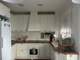 Conjunto de cocina en color blanco con un diseño acogedor y funcional. - Muebles de cocina blancos. - Encimera de madera. - Campana extractora. - Horno, lavavajillas y microondas - Fregadero sin grifería -