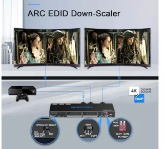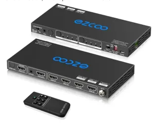 Matriz HDMI 4K HDR de la marca EZCOO, modelo EZ-MX4ZHAS-ARC. - Soporta resolución 4K HDR. - Conexiones HDMI 2.0. - Incluye función ARC (Canal de Retorno de Audio). - EDID y escalador integrados. - Mando a distancia incluido. Matriz HDMI ARC 4 en 2 salidas 4K HDR EDID 4K7.1/5.1/COPY Switch con extractor de audio SPDIF L/R - Escala inferior 4K a 1080P, D-o-l-b-y Vision Atmos en sincronización, interruptor HDMI 4x2 CEC