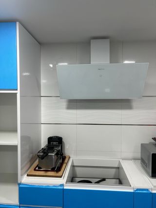 Campana extractora de cocina Mepamsa con acabado en cristal. - Diseño moderno y elegante. - Material: Cristal y acero inoxidable.Blanca ,su precio 300 euros,solo tiene de uso dos meses.Se vende por cambio de cocina completa.