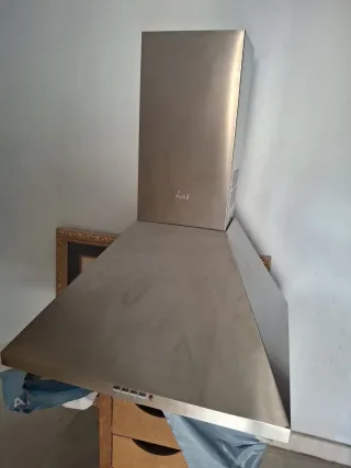Campana extractora de cocina fabricada en acero inoxidable. Su diseño moderno se adapta a diferentes estilos de cocina. - Material: Acero inoxidable. - Acabado cepillado. - Incluye conducto de extracción. Necesita limpieza a fondo , pero funciona perfectamente