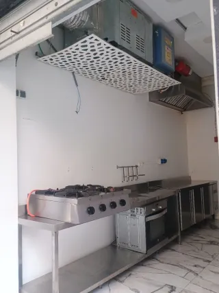Equipamiento de cocina profesional para local de hostelería. - Cocina de gas de 4 fuegos. - Encimera de acero inoxidable. - Horno. - Campana extractora.