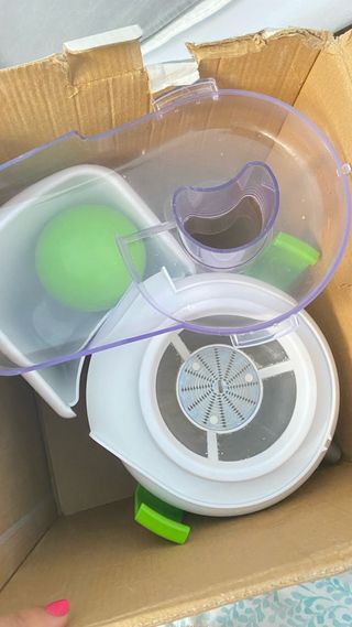Extractor de zumo San Ignacio en buen estado. - Diseño moderno en blanco y verde. - Incluye recipiente para pulpa. - Piezas de plástico transparente.