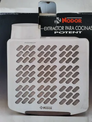 Extractor de cocina de la marca NODOR, modelo POTENT. Diseñado para cocinas. No sé ha instalado nunca. Nuevo a estrenar. - Diseño blanco con rejilla. - Salida de aire superior.