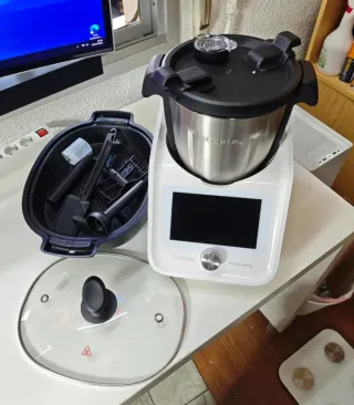 Usado 5 veces, tengo demasiados electrónicos, por eso vendo este. Especificaciones 2000W Pantalla táctil de 7 pulgadas 28 funciones culinarias: Procesa, rebana, corta, pulveriza, tritura, pica, emulsiona, ralla, trocea, muele, monta, amasa, mezcla, remueve, bate, confita, cocina con precisión, con fuego lento, al vapor, hierve, sofríe, licua, fermenta, turbo, calienta, mantén caliente y pesa. 12 velocidades + turbo Jarra de acero inoxidable de 4,5L Báscula integrada 150 recetas integradas Conexión WiFi Rango de temperatura: 37-130º 2 modos de cocinado: manual o recetas guiadas. Recoger en Alcorcón o envío.