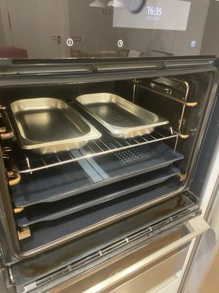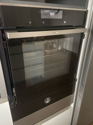 Horno con menos de un año y con muy poco uso. Con funciones extra de: cocción al vapor, freidora de aire caliente, autolimpieza,secado, aire al vacio, descongelar, fermentar, etc. Dos bandejas con rejilla grill. Conexión wifi para manejar el horno con el móvil.