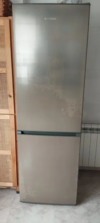 Frigorífico de la marca Daewoo con acabado plateado. Se vende por cambio por uno más grande.