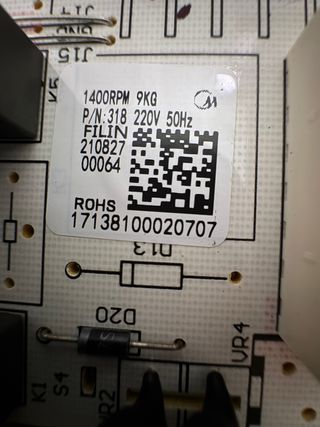 Placa electrónica de lavadora Evvo W3.9E B. - Modelo: 1400RPM 9KG - Voltaje: 220V 50Hz - Número de parte: 318 - Código: 210827 00064 - Cumple con RoHS