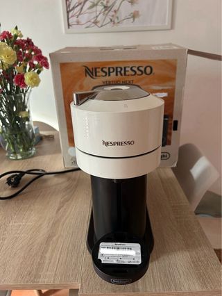 ✅Increíble Cafetera Nespresso Vertuo Next de Delonghi. Para disfrutar de una inmensa variedad de deliciosos cafés de nesspreso, no te lo puedes perder!!. Además está en perfecto estado, con su caja y el ticket de compra. Usada unicamente con las cápsulas que vienen de prueba. - Modelo: Vertuo Next - Marca: Nespresso - Fabricante: Delonghi - Color blanco y negro elegante.