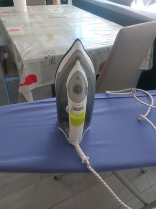Plancha de vapor en buen estado. Es blanca y gris, con detalles en verde. - Funciona correctamente. - Fácil de usar. - Diseño moderno y ligero.