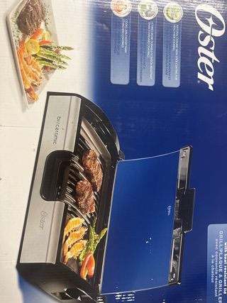 Parrilla eléctrica Oster con superficie de biocerámica, completamente nueva y sin usar. Es compacta y fácil de guardar. - Superficie antiadherente de biocerámica. - Diseño elegante y moderno. - Fácil de limpiar.