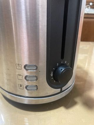Tostadora de pan plateada con acabado en negro. - Diseño moderno y elegante. - Materiales de calidad.