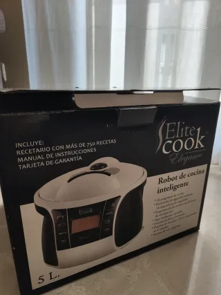 Robot de cocina Elitecook Elegance, con capacidad de 5 litros. Incluye recetario con más de 750 recetas, manual de instrucciones. - 12 programas de cocina. - Protección de seguridad. - 14 dispositivos de seguridad. - Programación de cocina con 24 horas de antelación. - Tapa totalmente extraíble. - Función de freír y hornear. - Función de vapor y cocción programable. - Sistema de auto-limpieza. Se conserva en caja original.