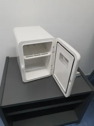 Nevera portátil de color blanco con un diseño moderno y compacto. Ideal para mantener tus bebidas y alimentos frescos. - Asa plateada para facilitar el transporte. - Ventana ovalada en el lateral. NUEVA - No se ha usado