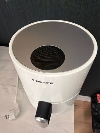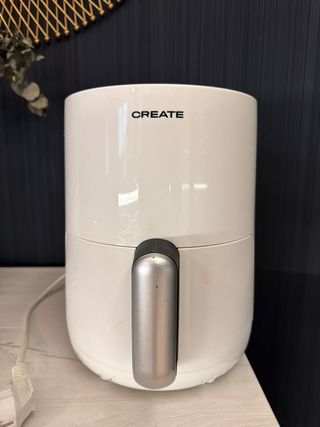 Freidora de aire marca CREATE en color blanco. Diseño moderno y compacto. - Asa extraíble para facilitar su uso. - Panel de control en la parte superior. boton encendido hay que apretarle fuerte.