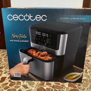 Freidora de aire Cecofry Supreme 8000 de Cecotec. Diseño moderno en color negro y plateado. - Capacidad de 8 litros. - Panel de control digital. - Incluye cesta para alimentos. La he usado 1 vez, hace una semana que la he comprado, con ticket y garantia, la compre para hacerle comidas al bebe pero no me gusta, se puede ver y probar sin compromiso.