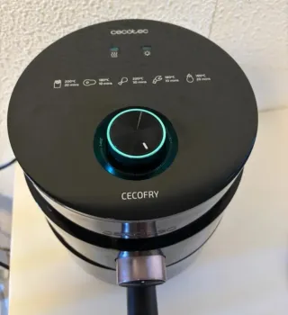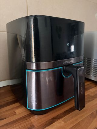 Freidora de aire Cecofry de la marca Cecotec. Diseño moderno en color negro y plateado.5 litros Poco uso - Asa extraíble para facilitar su uso. - Acabado brillante en la tapa superior. Se ha rajado la carcasa lateral , pero funciona perfectamente