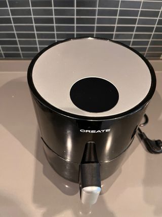 Freidora de aire marca Create en color negro y con capacidad de 3.5 litros. Se encuentra en buen estado. El único defecto que tiene es que no se enciende la luz del botón “-“ para regular la temperatura y tiempo de cocción pero el botón funciona igual. - Diseño moderno y compacto. - Fácil de usar y limpiar.