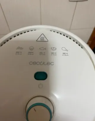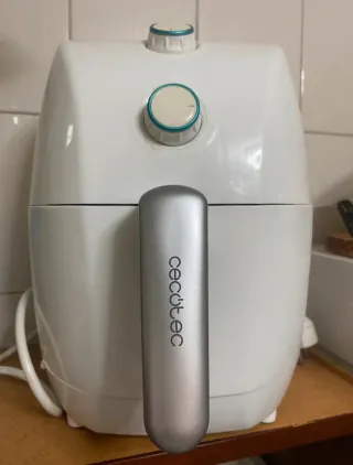 Freidora de aire Cecotec en color blanco. Capacidad 1,5 litros. - Diseño moderno y compacto. - Asa plateada con logo. - Dos mandos giratorios en la parte superior. Tiene un pequeño deperfecto en el exterior pero funciona perfectamente. Los números de los mandos se borraron al limpiarla. La rueda de arriba es el tiempo y la de abajo la temperatura. Tengo caja y libro de instrucciones con recetario.