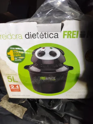 Freidora dietética Frei Matic con capacidad de 5 litros. Permite cocinar de forma rápida, limpia y saludable. - Cocina con solo una cucharada de aceite. - Función de freír y hornear. - Diseño moderno y compacto. - Sin salir nunca de su embalaje,la caja un poco sucia de estar guardada. En perfecto estado ,no la saco para hacerle fotos porque nunca salió de su embalaje así va perfecta. - Nueva a estrenar