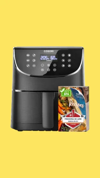 Freidora de aire Cosori de 5.8 cuartos de galón. Diseño moderno en color negro. - Capacidad de 5.8 litros. - Acabado brillante en la tapa.