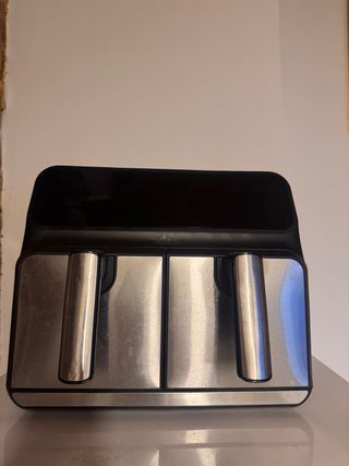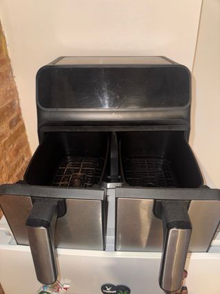 Freidora de aire doble con acabado en acero inoxidable. Se encuentra en muy buen estado y ha tenido muy poco uso. - Diseño moderno en acero inoxidable. - Dos cestas independientes para cocinar diferentes alimentos a la vez.