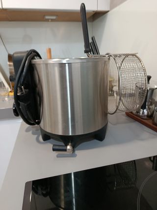 Freidora movilfrit de acero inoxidable con tapa negra. Cesta de residuos de regalo (comprada aparte) Funciona con aceite y agua Usada muy pocas veces, se encuentra tal y como se ve en las fotos.