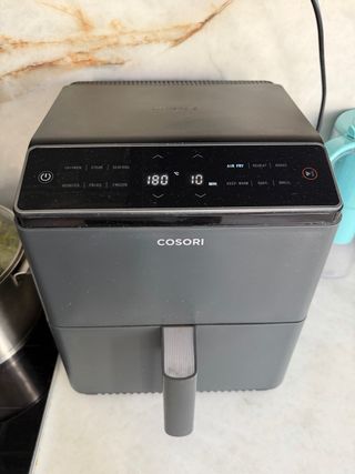 Freidora de aire marca Cosori en color negro. Cuenta con panel de control digital. - Programas preestablecidos: Pollo, Verduras, Congelados, Pescado, Patatas fritas, Repostería, Carne, Mariscos, Calentar, Deshidratar. - Función de mantener caliente. - Temporizador y control de temperatura.
