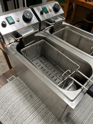Freidora profesional de doble cuba con una capacidad total de 8 litros. Fabricada en acero inoxidable, es ideal para negocios de hostelería. - Dos cubas independientes. - Construcción robusta en acero inoxidable. - Controles de temperatura.